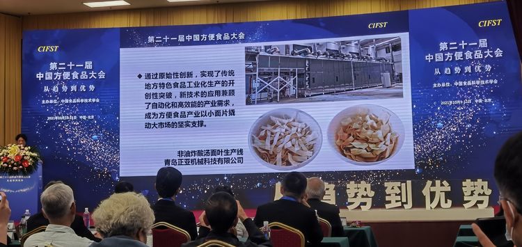大會邀請多位行業(yè)專家及龍頭企業(yè)代表從多角度多方位剖析了行業(yè)面臨的現(xiàn)狀,展望行業(yè)未來發(fā)展。青島正亞機械科技有限公司很榮幸參加,并憑借“非油炸酸湯面葉生產(chǎn)線”榮獲“中國方便食品行業(yè)優(yōu)秀創(chuàng)新產(chǎn)品”獎項。