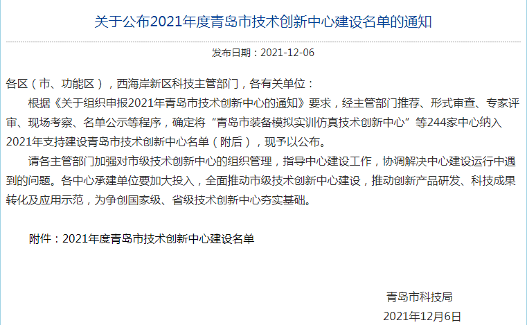 2021年12月6日,青島市科技局公示了2021年度技術創(chuàng)新中心建設名單,青島正亞機械科技有限公司在眾多參選企業(yè)中脫穎而出,成功入選。